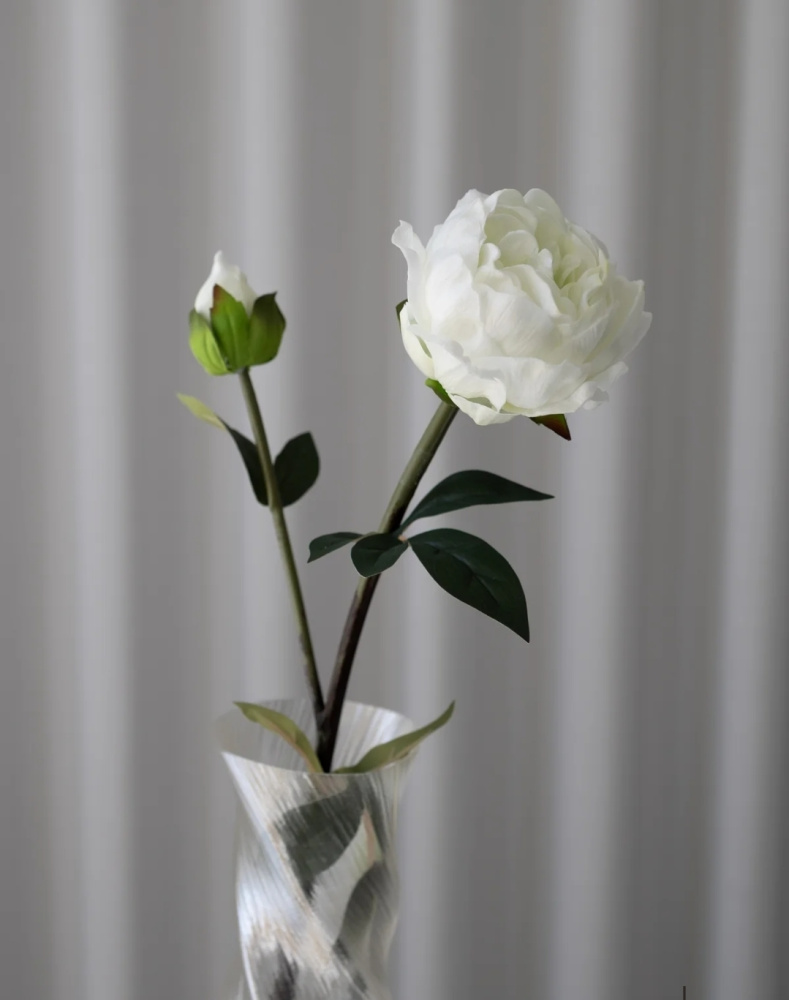 Denne grasiøse peonen fanger den delikate sjarmen til blomsten i tilstanden den er lukket, og utstråler en diskret skjønnhet og sofistikert eleganse. De myke hvite kronbladene er mesterlig formet for å etterligne naturens milde kurver, og gir et fredelig og raffinert preg til ethvert miljø.